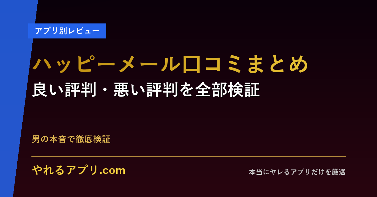 TOP3の詳しい比較は やれるアプリTOP3ランキング記事 にまとめています。また、各アプリ単体のレビューは ワクワクメール完全レビュー、ハッピーメール完全レビュー、PCMAX完全レビュー をどうぞ。
